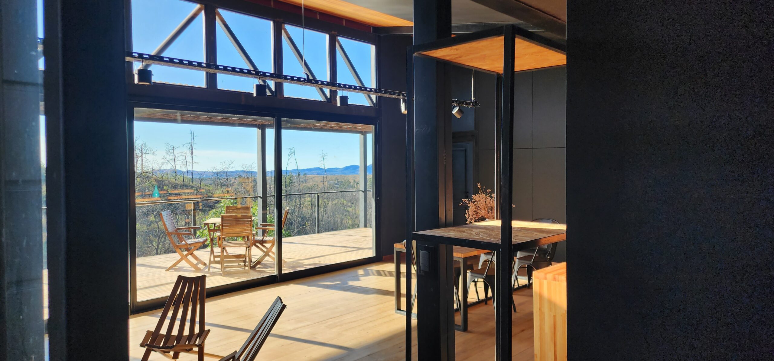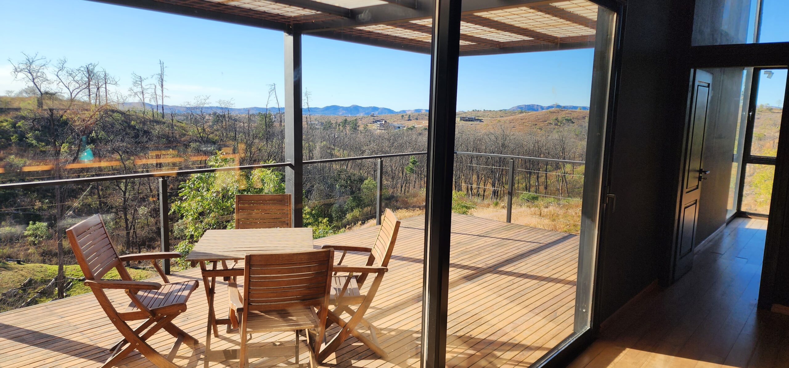 * Pasarela de madera y casa sobre-elevada con vistas panorámicas a las sierras 🌄